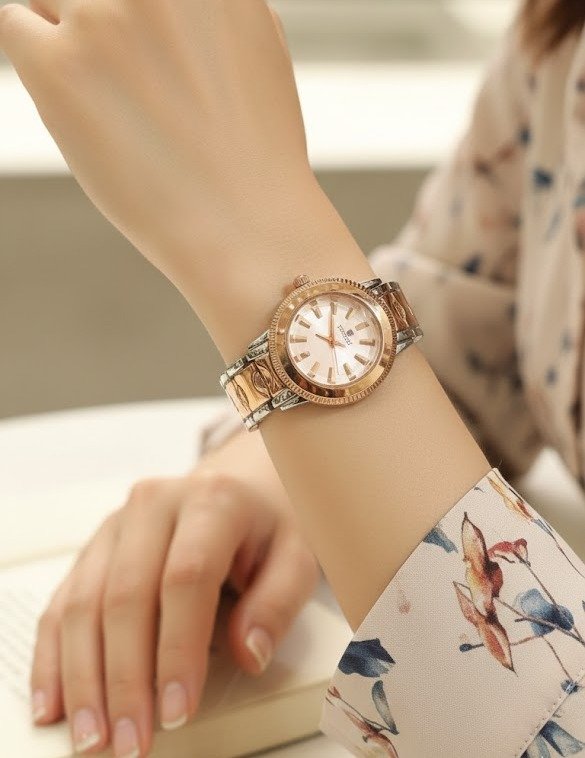 Unique Link Bracelet: The decorative links feature a stylish circular motif, offering the comfort of a watch with the aesthetic of a piece of jewelry.
