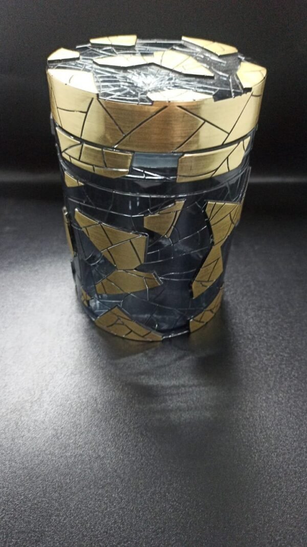 Design: Tall cylindrical silhouette with matching mosaic lid.