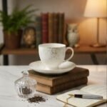 Refined Design: Subtle gold-leaf accents and intricate line art on a creamy white porcelain finish.