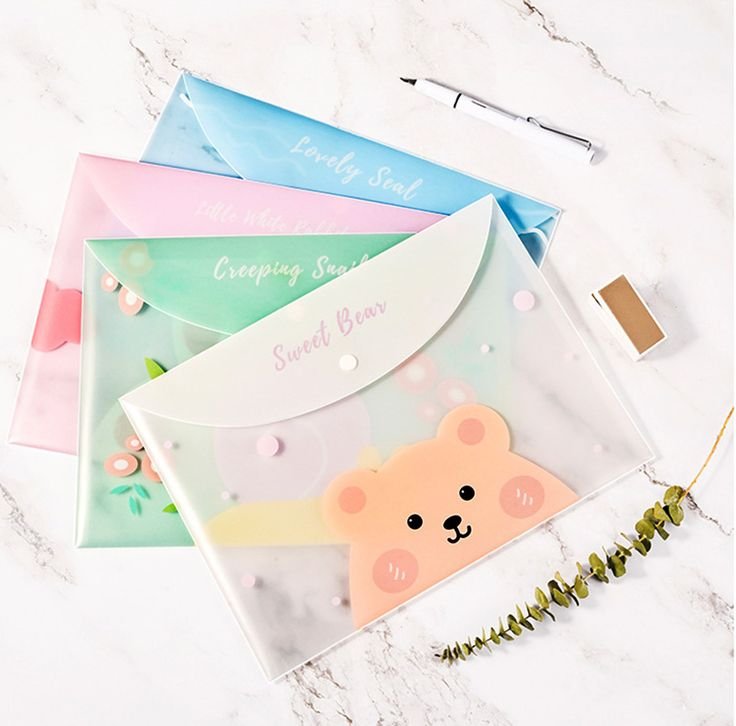 Charming Design: Features a sweet, peek-a-boo “Sweet Bear” character on the front folder, along with soft, cute illustrations and playful text on the others (including “Lovely Seal,” “Little White,” and “Creeping Snail”).