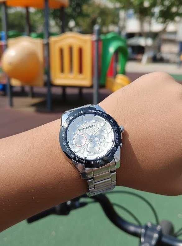 Tachymeter Bezel: The sleek black fixed bezel includes a tachymeter scale, adding a professional racing-inspired edge to the design.