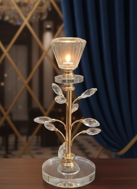 Reflective Beauty: The multifaceted crystal elements create a shimmering effect when paired with a lit candle.