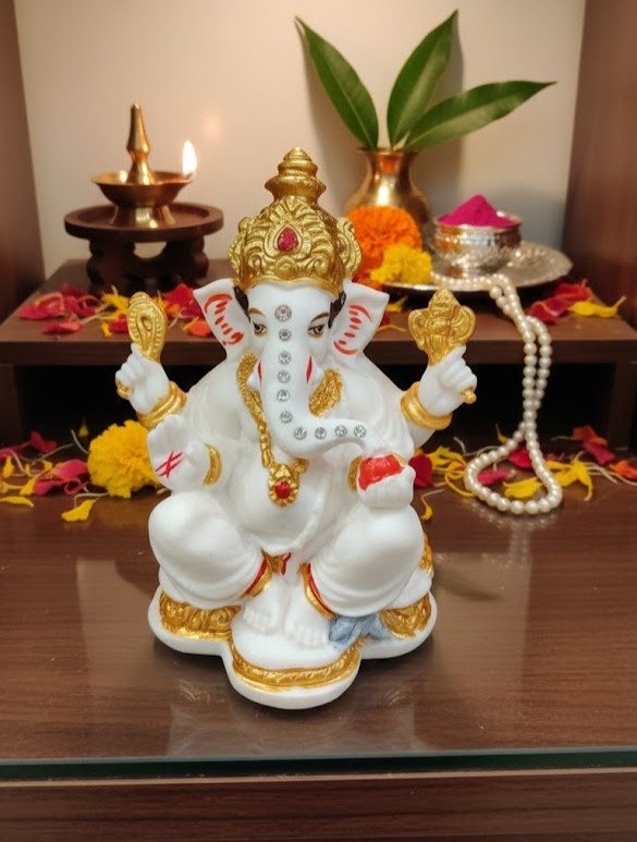 Divine Blessings Ganesha Idol – White & Gold Finish