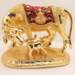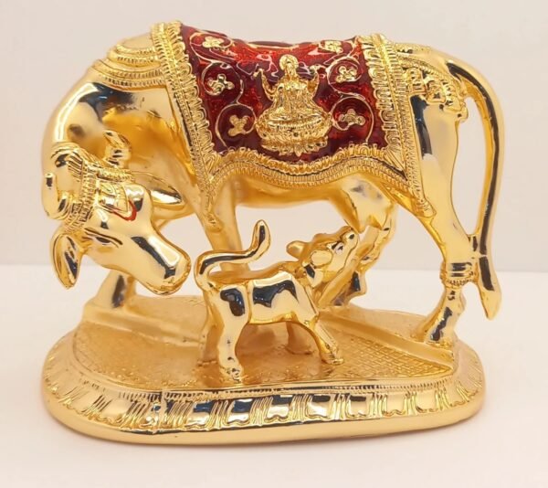 Bring home the blessings of abundance and peace with our exquisitely crafted Kamdhenu Cow and Calf idol. Representing the “Mother of all Cows,” this sacred piece features the divine cow nursing her calf, symbolizing selfless love and the fulfillment of all desires. Finished in a radiant gold polish with intricate red and green enamel work (Meenakari style), it serves as a perfect spiritual centerpiece for your home or office.