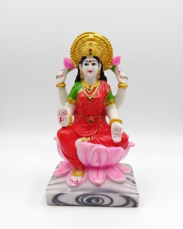 Symbolic Posture: Depicted in the Padmasana (lotus pose) with her hands in the Abhaya Mudra, symbolizing protection and blessing.