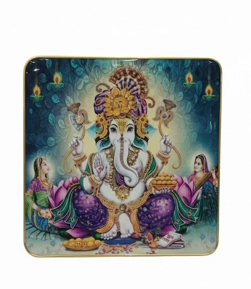 Intricate Artistry: Lord Ganesha is depicted in rich purple and emerald green attire, adorned with golden ornaments. He is flanked by his consorts, Riddhi (Prosperity) and Siddhi (Intellectual Power), symbolizing a complete life of success and harmony.