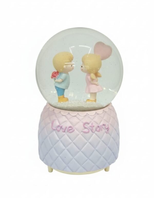 Heartfelt Design: Features a boy hiding a bouquet of flowers and a girl holding a heart balloon, set within a classic glass sphere.