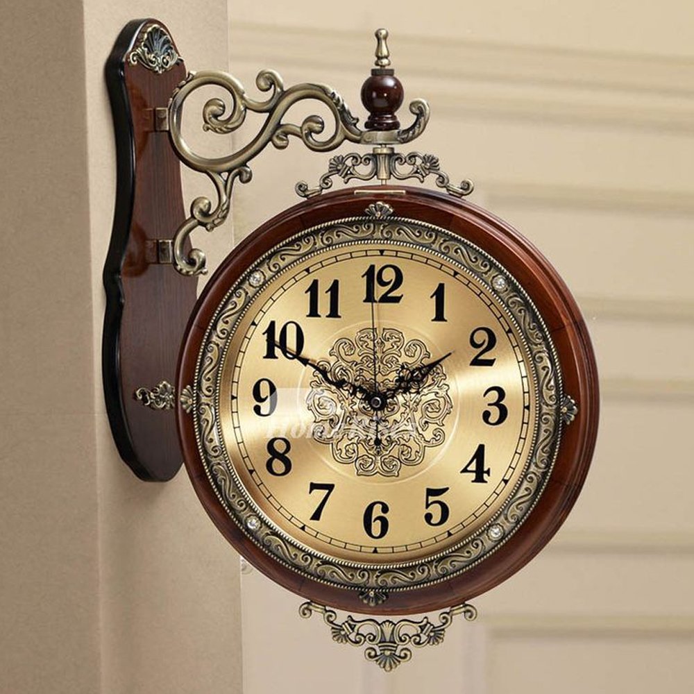 Add a touch of classic sophistication to your home or office with this magnificent wall clock from Samra. Designed in a luxurious European vintage style, it features a rich dark wood finish casing and a striking antique brass/gold-tone dial with clear black Arabic numerals. The ornate, scroll-work metal bracket allows the clock to hang perpendicular to the wall, it ads elegance to your interior.