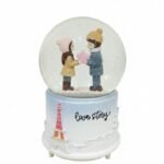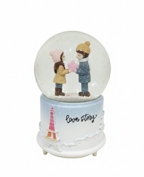 Whimsical Design: Intricately detailed figurines of a couple in winter attire, surrounded by shimmering glitter “snow.”
