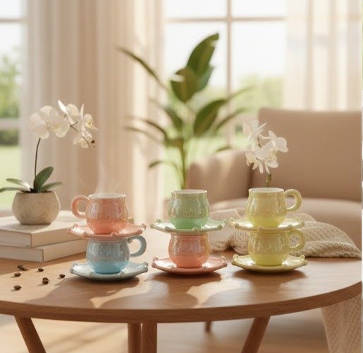 Ergonomic Design: Rounded, easy-to-hold handles and uniquely scalloped saucers for a modern, artistic flair.