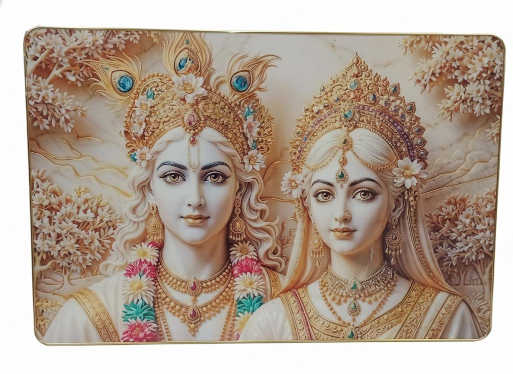 Intricate Craftsmanship: Featuring highly detailed imagery, from the delicate peacock feathers in Krishna’s crown to the ornate jewelry and floral garlands, every element is rendered with precision.