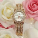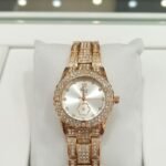 Radiant Design: Featuring a lush rose gold finish that complements all skin tones, this watch is fully encrusted with shimmering crystals along the bezel and the articulated link strap.