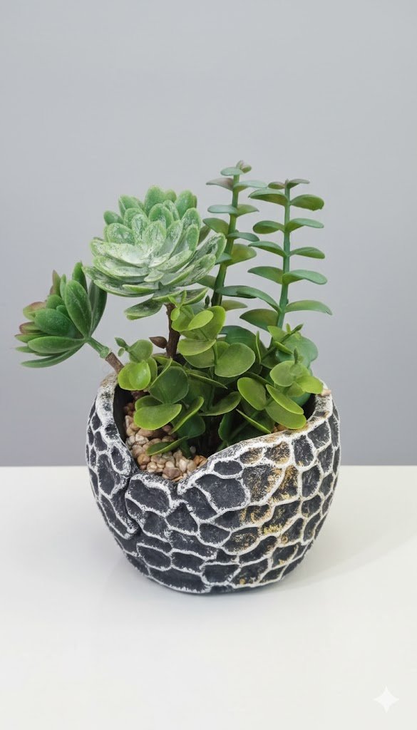 Artisanal Planter: The pot features a striking, tactile “honeycomb” or cracked-stone texture in a sophisticated charcoal grey and white palette, accented with subtle gold highlights.