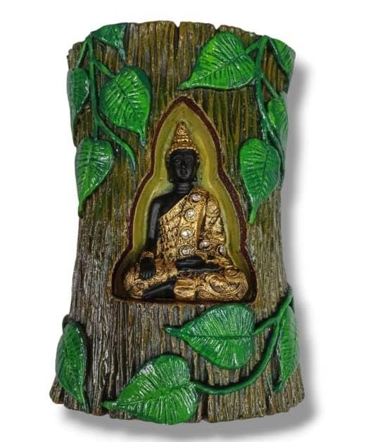 Nature-Inspired Aesthetic: The frame is sculpted to mimic the rugged bark of a tree, embellished with vibrant green Bodhi leaves that wrap around the piece, symbolizing growth and life.
