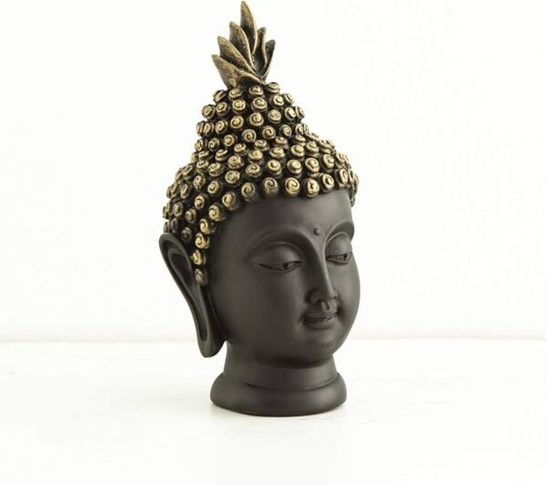 Artistic Detail: Features a sophisticated matte black finish contrasted by intricate, hand-painted gold highlights on the Ushnisha (the flame of supreme enlightenment) and snail-shell curls.