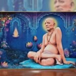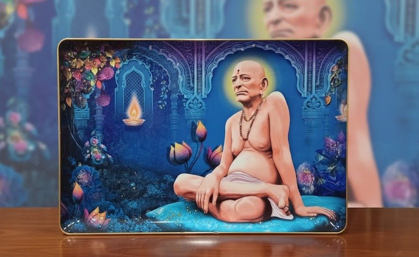 Symbolic Detail: Depicts Swamiji in his iconic seated posture, accompanied by a glowing diya (lamp) and blooming lotuses, symbolizing the removal of darkness and the awakening of the soul.