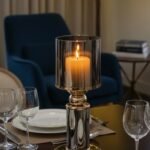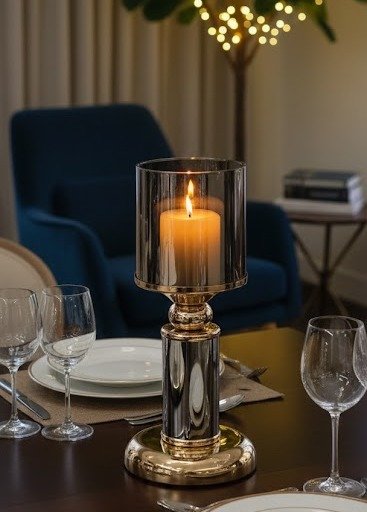 Ambient Lighting: The grey-tinted hurricane glass reduces glare while creating a moody, intimate atmosphere.